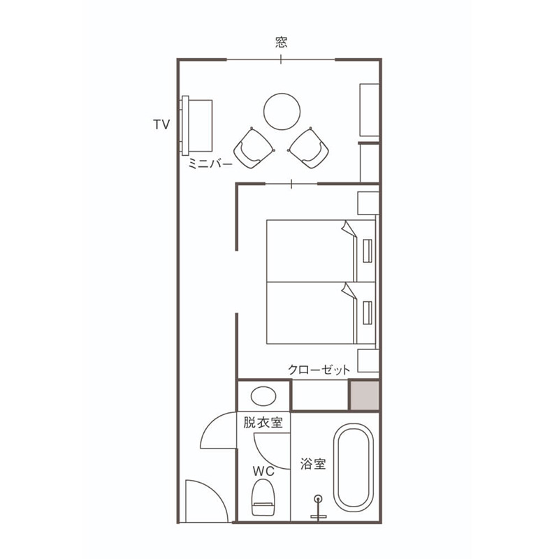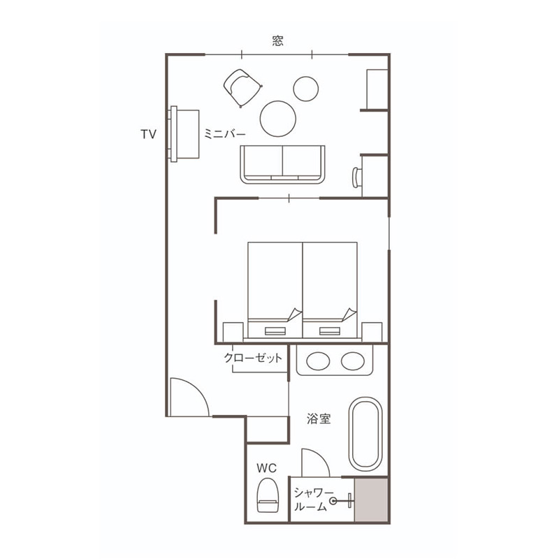 エントランス側の角部屋で、ベッドルームにも明かり取りの窓がある客室。広々としたシャワーブース付のバスルームを備え、万平ホテルらしさを最大限に感じられる設えの中に機能性が加わったお部屋です。