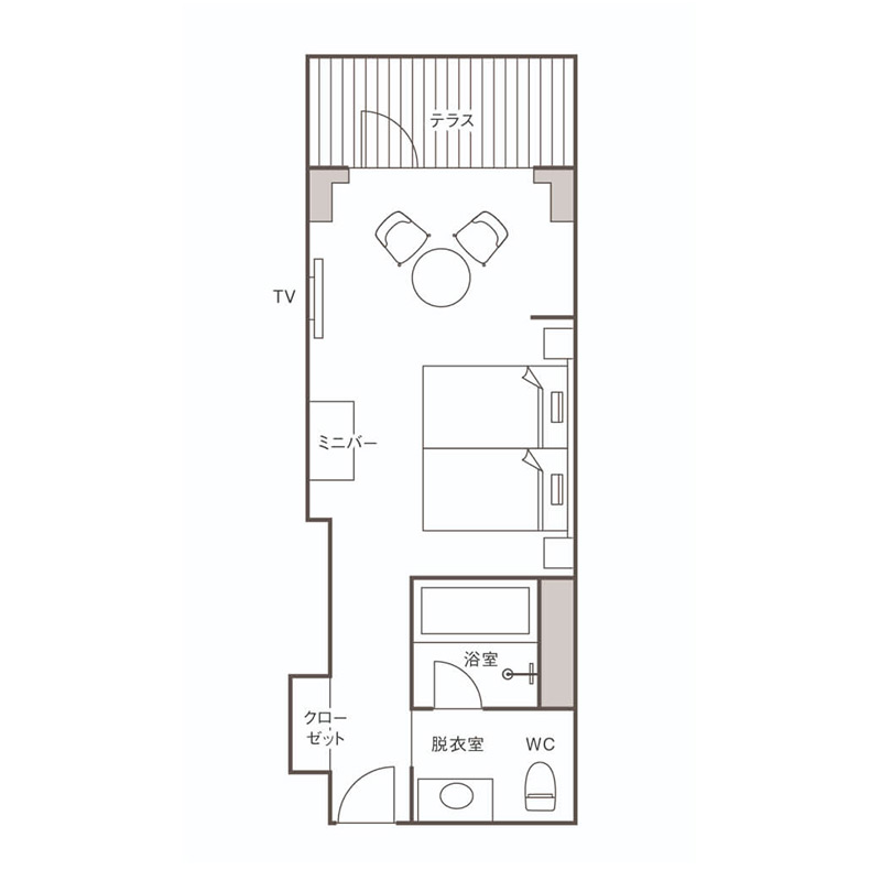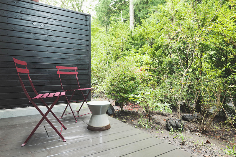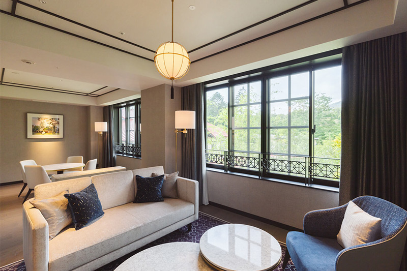 クラシカルな面影を残しながら、現代的なデザインを施した新たな和洋折衷の客室。専用のテラスからは、軽井沢の豊かな自然をお楽しみいただけます。