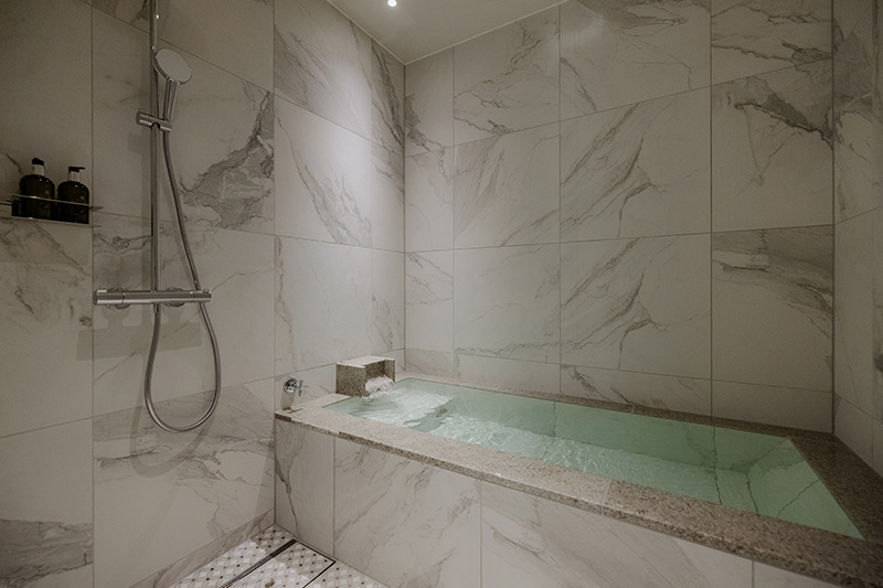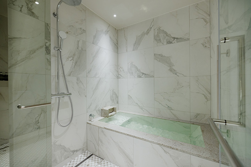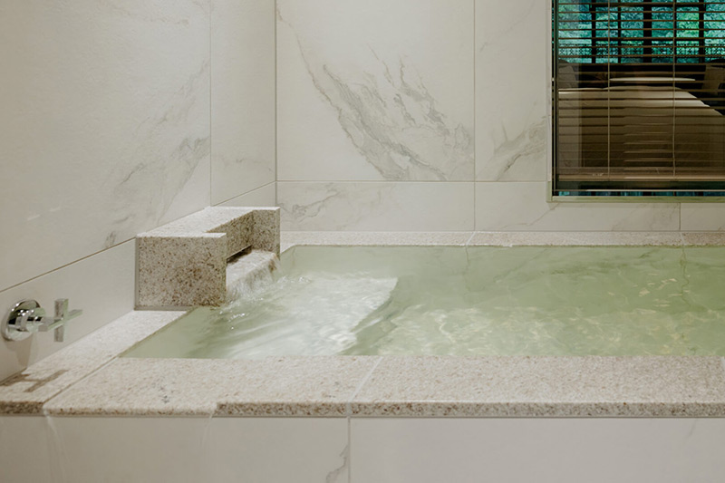 愛宕館の全客室でお楽しみいただける「塩沢温泉」は、"熱の湯"と呼ばれる保温効果に優れたお湯。塩分を多く含むお湯で、短時間の入浴でも身体の芯から温まり、湯冷めもしにくいため、神経痛や冷え性などの症状に効果があります。