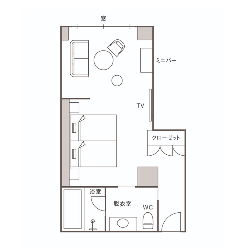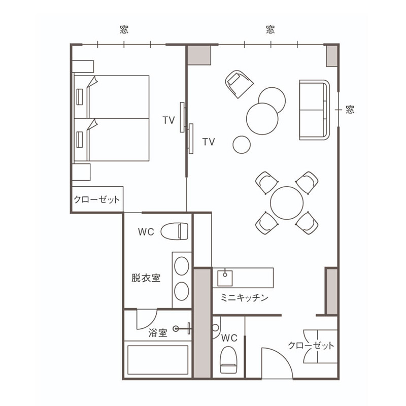 愛宕館プレミアよりも広々とした56平米のツインルーム。クラシカルな面影を残しながら、現代的なデザインを施した新たな和洋折衷の客室です。広々としたお部屋からは中庭を望み、軽井沢の美しい四季折々の景色を満喫していただけます。