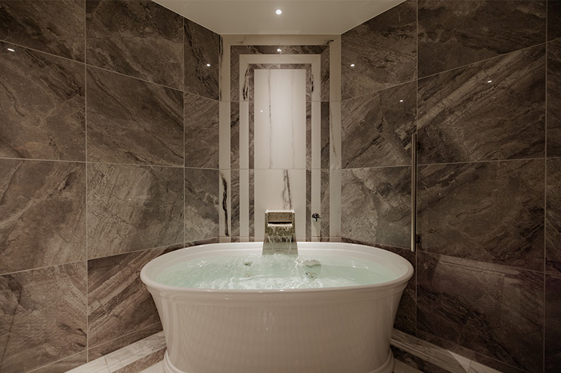 広々としたリビングルームからはアルプス館と、季節の移ろいを感じる中庭を望む最上級のお部屋。「万平スイート」の名に相応しく、随所に万平ホテルのモチーフが取り入れられ、新しいながらもホテルの歴史を感じられる空間です。喧噪のときを忘れ、ゆったりとした寛ぎの時間をお楽しみください。