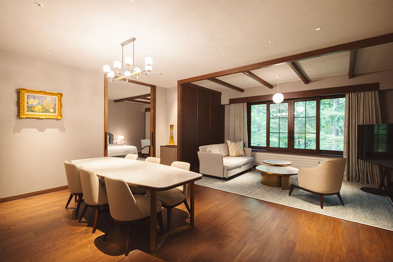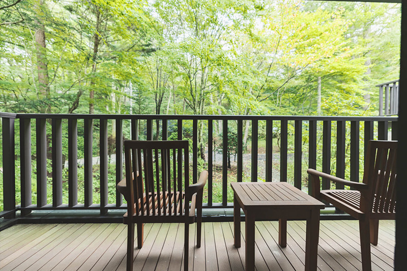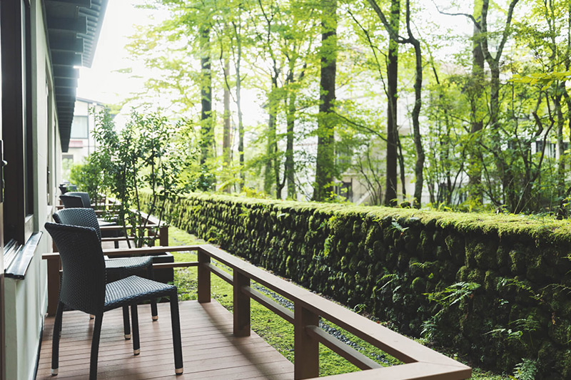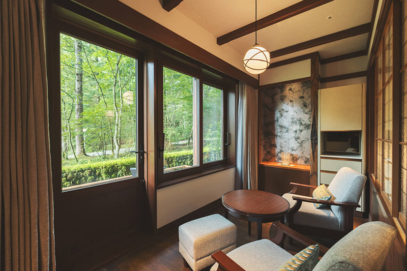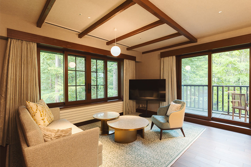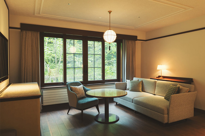 グリーンを基調としたインテリアとクラシカルな設えが調和した落ち着いた客室。広々とした客室から見える緑が室内の彩りをさらに際立たせてくれます。専用のテラスからは、軽井沢の豊かな自然をお楽しみいただけます。