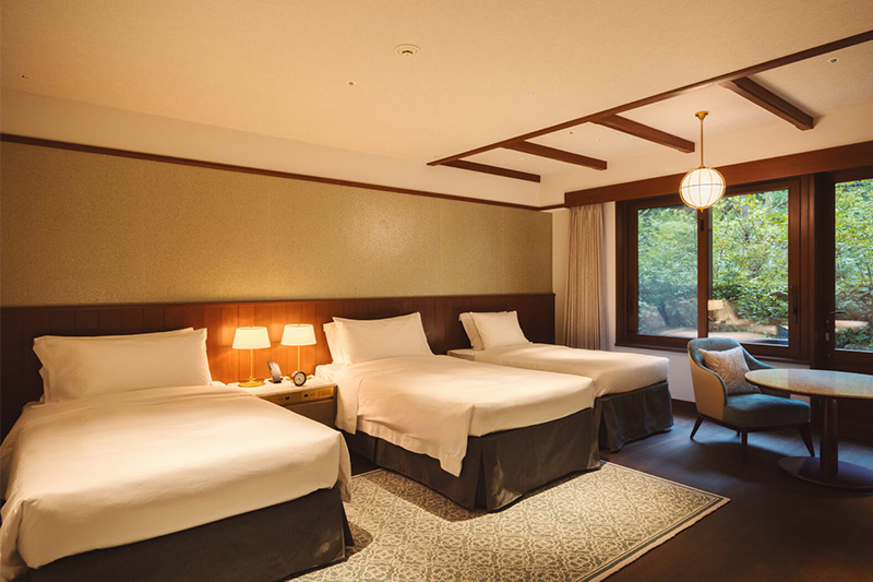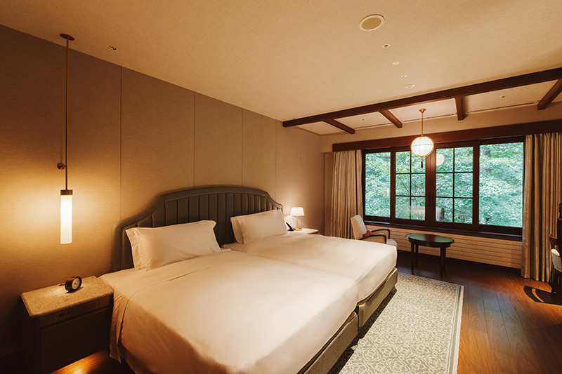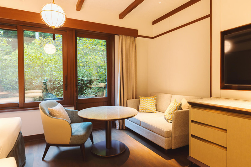 グリーンを基調としたインテリアとクラシカルな設えが調和した落ち着いた客室。広々とした客室から見える緑が室内の彩りをさらに際立たせてくれます。