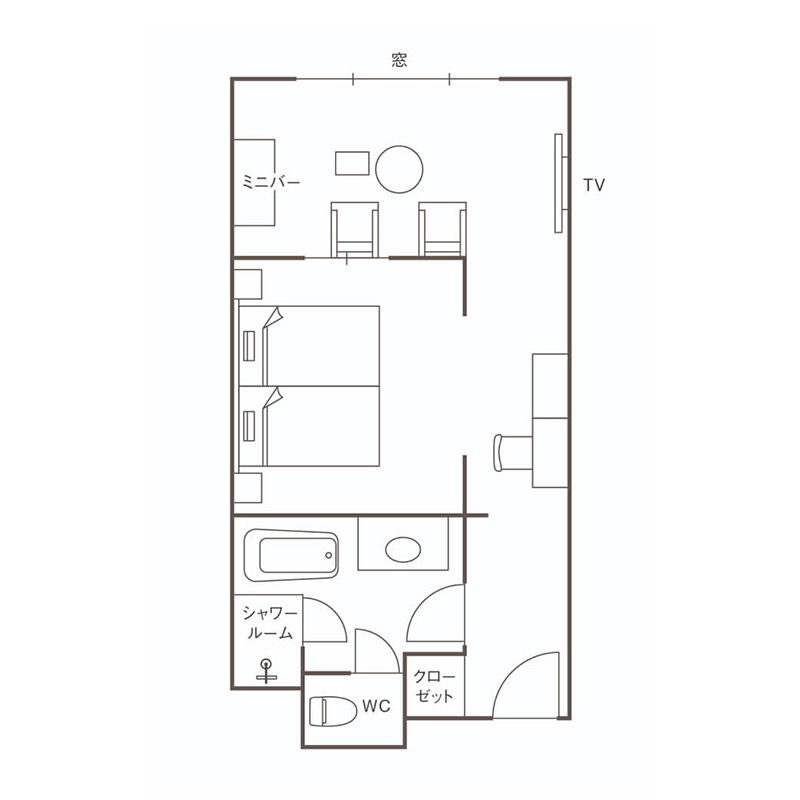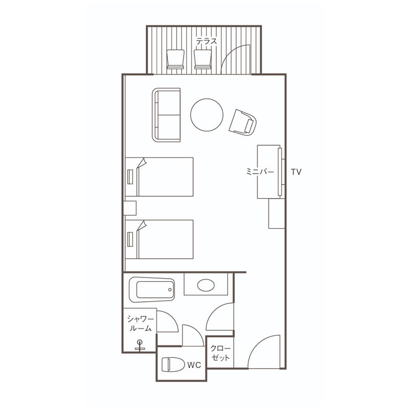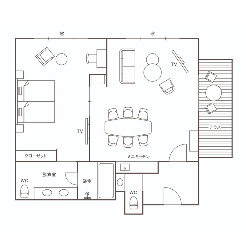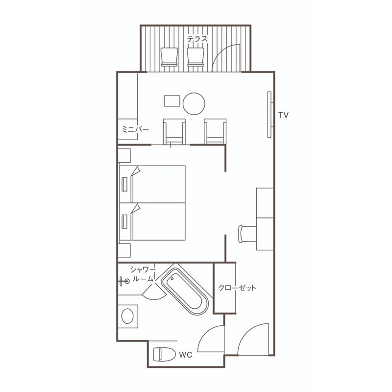 アルプス館のクラシカルなインテリアデザインを継承しつつ、碓氷館の周囲で感じられる四季を取り入れ、木々や花々の息吹を想起させる優しい色合いが調和した客室です。専用のテラスからは、軽井沢の豊かな自然をお楽しみいただけます。