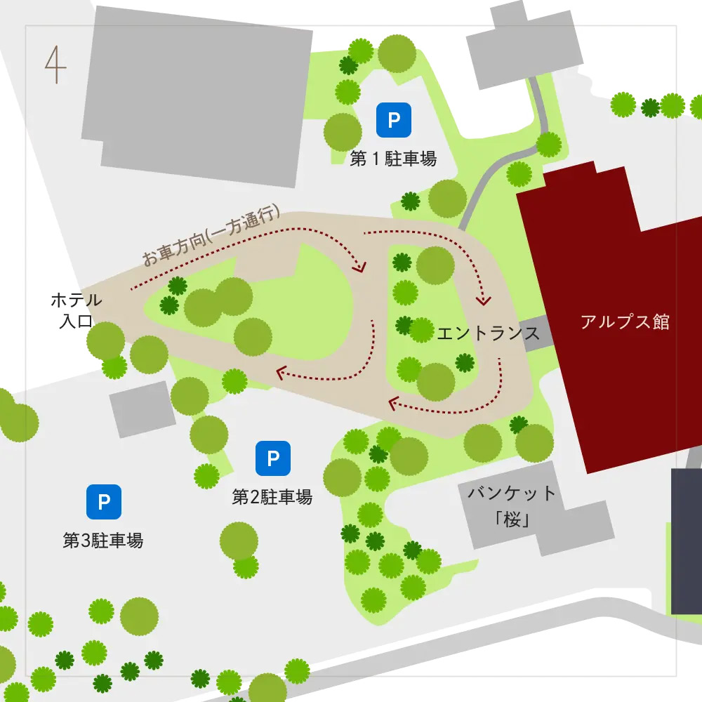 駐車場は無料でご利用いただけます。ご宿泊のお客様はご宿泊者様専用駐車場をご利用ください。レストラン等ご利用のお客様も、敷地内駐車場をご利用いただけますが、万が一満車の場合には、近隣の駐車場をご利用いただく場合がございます。あらかじめご了承ください。