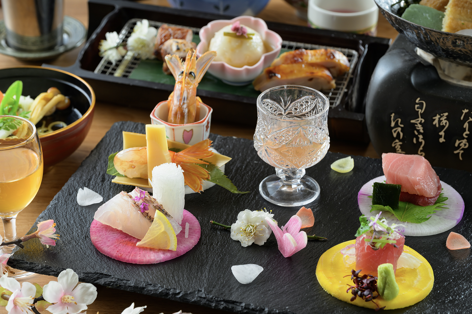 基本創作和会席 特製梅酒から始まり、季節の華やかな前菜。鮮度高いお造りからメインのお料理まで、五感でお楽しみいただけるお料理の数々。郷土の味わい豊かな献立もぜひお楽しみください。