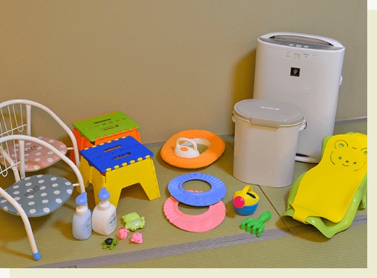 お子さまのお泊りをサポートする、お部屋やお風呂、お食事会場でご利用いただけるさまざまな貸出グッズをご用意しております。