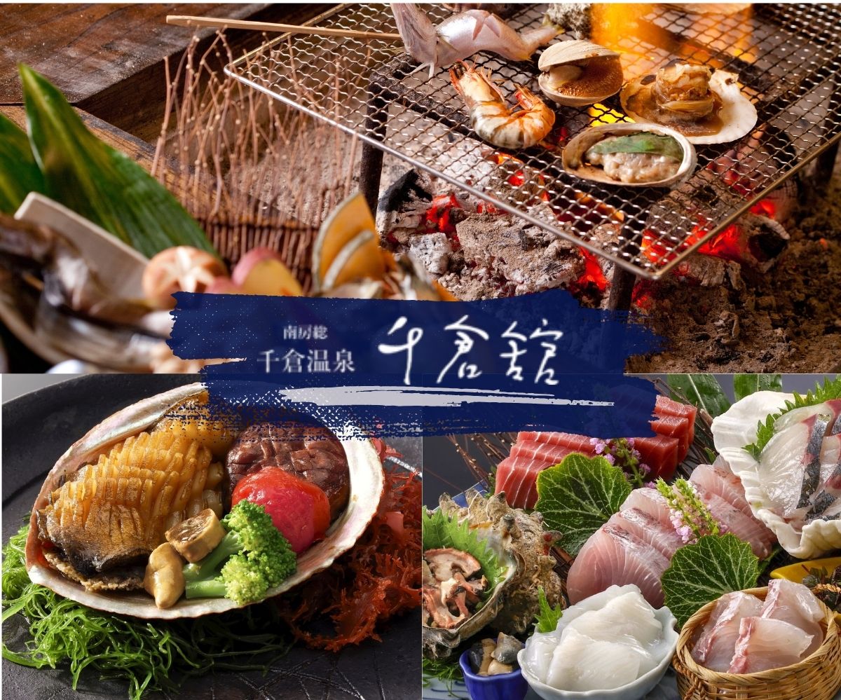 太平洋と千倉橋のほとりに位置する千倉温泉は遠く鎌倉時代、源頼朝が愛馬の傷を癒やしたと云う伝説があり神経痛、関節痛、五十肩、糖尿病などの効能がありますが特に皮膚の新陳代謝に優れた効果を持っています。料理は千倉漁港でとれた海の幸を魚貝盛り付のフルコースや囲炉裏を囲んでの炭火料理も楽しめる。