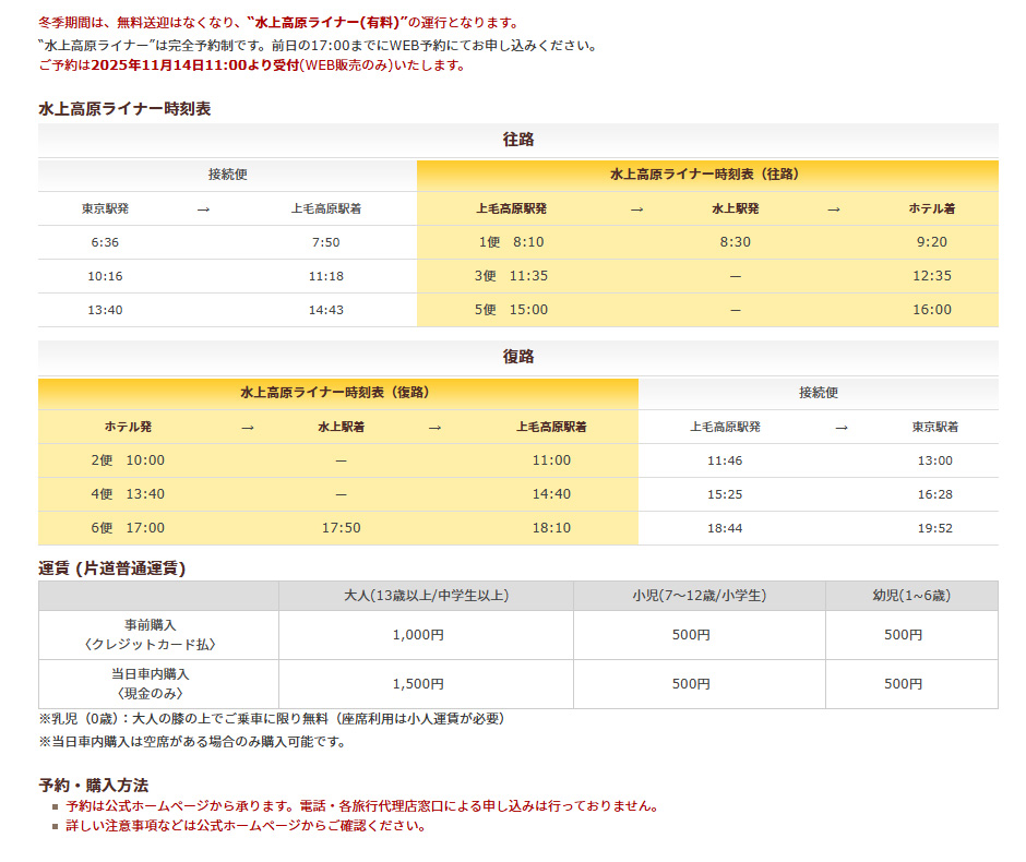ご利用は、ご宿泊および バス乗車日に「水上高原ゴルフコース」「水上高原フォレストジップライン」等各種アクティビティを事前に予約済の方に限ります。(日帰り入浴、ご昼食のみのご利用の場合はご乗車いただけません)