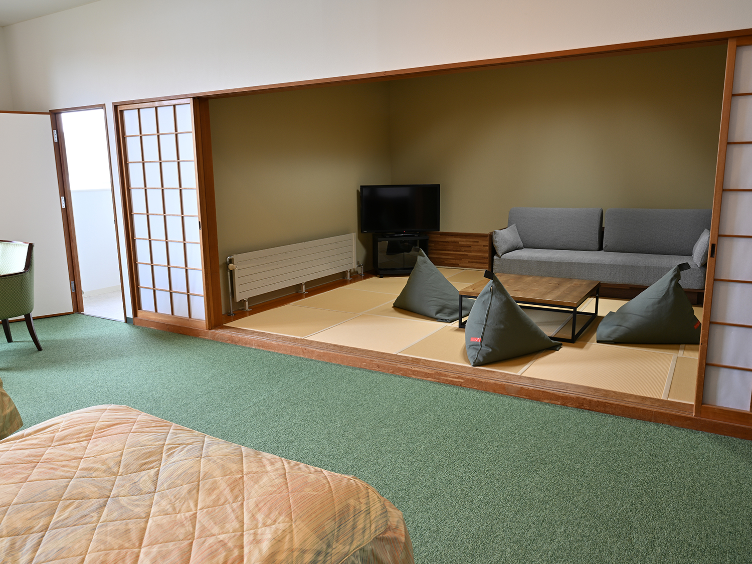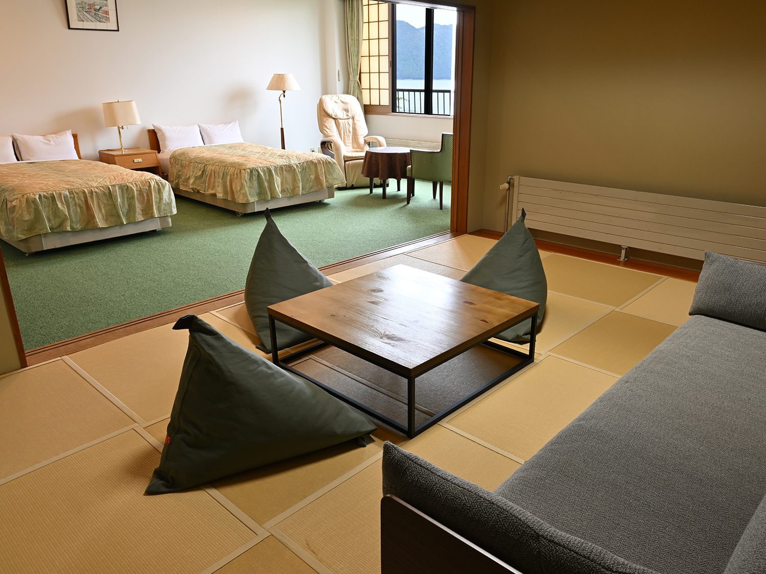 おとなりの10畳相当の和室には座り心地のいい硬めのソファと過度な沈み込みでリラックスできるビーズ
