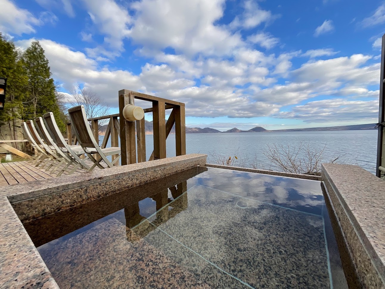 サウナ熱によって深部体温の上昇が完了したらサウナドアから三歩で水風呂 〆はこちらも二歩で外気浴目の前にはもちろん絶景支初湖が待っています。