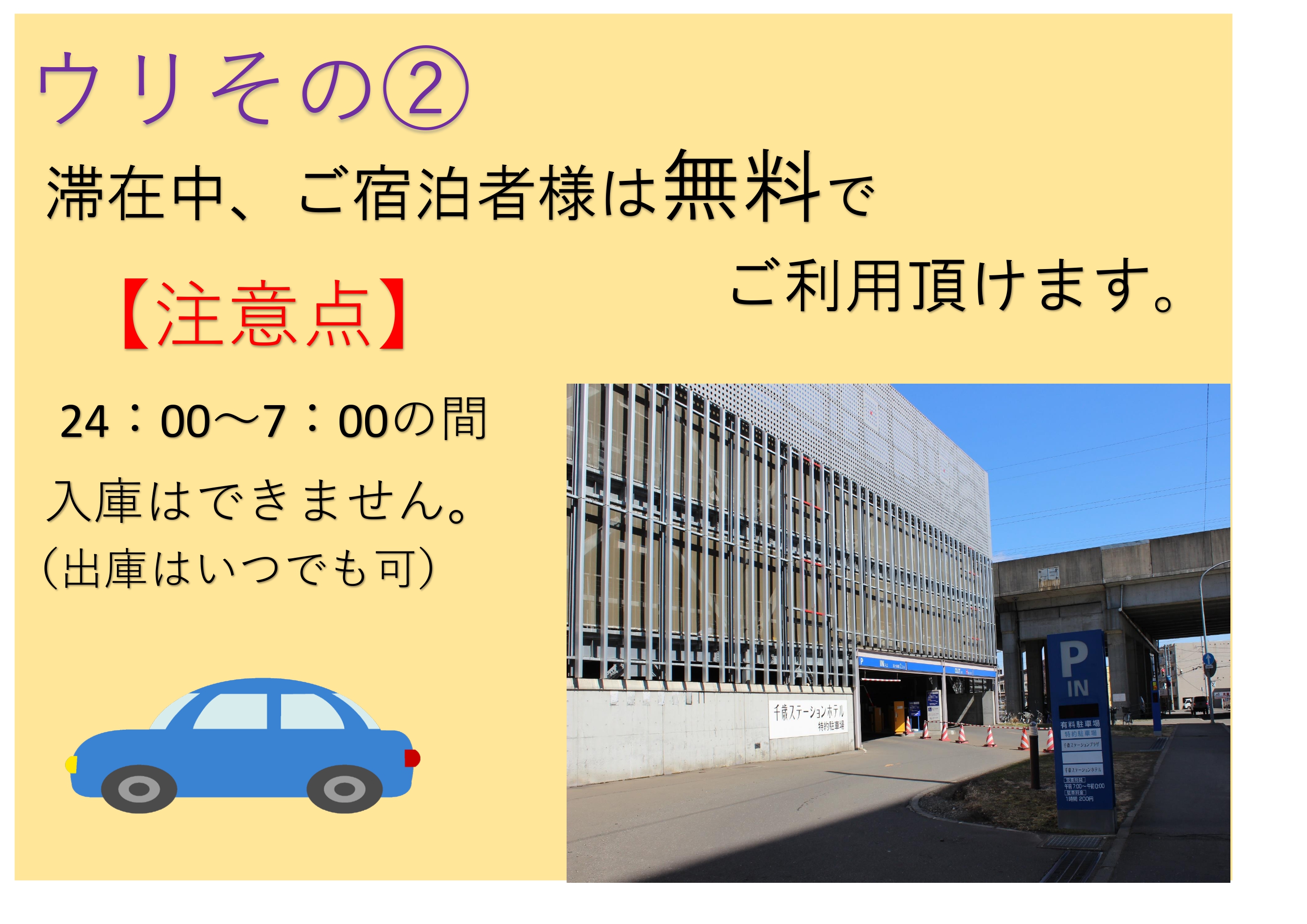 ①JR千歳駅直結&新千歳空港駅まで電車で7分②滞在中駐車場無料