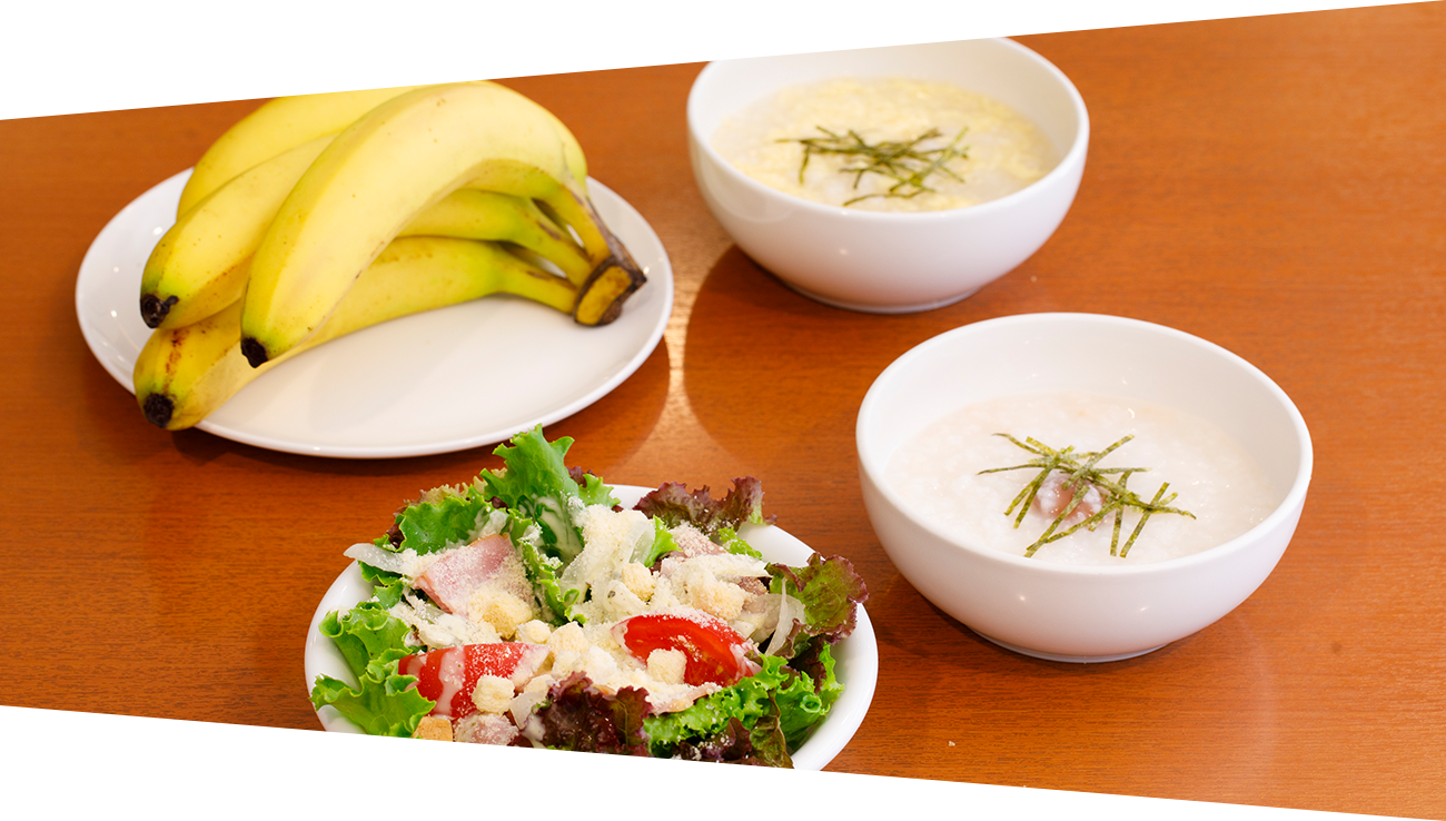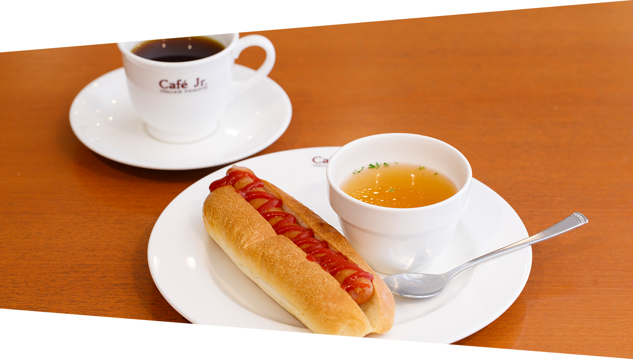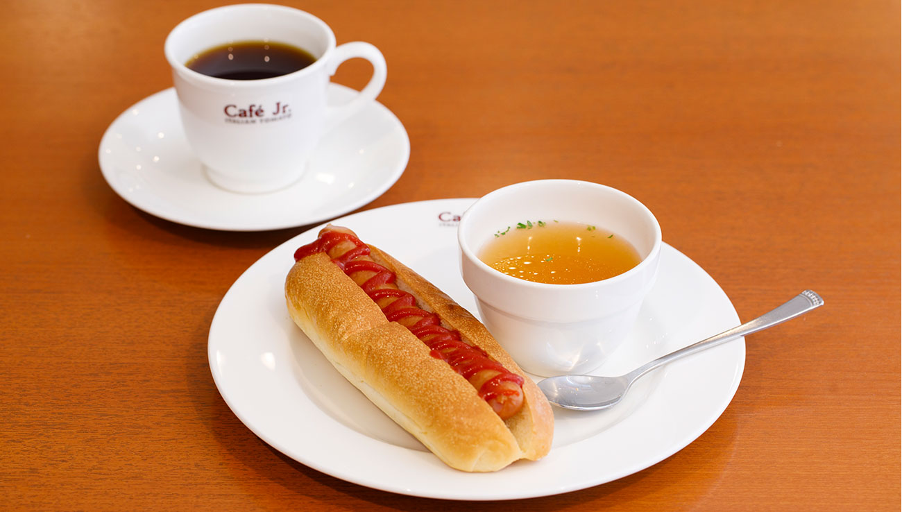 ホットドッグ・トースト・パンケーキからお好きなパン1点と スープ、お飲み物がセットになった無料朝食サービスです。