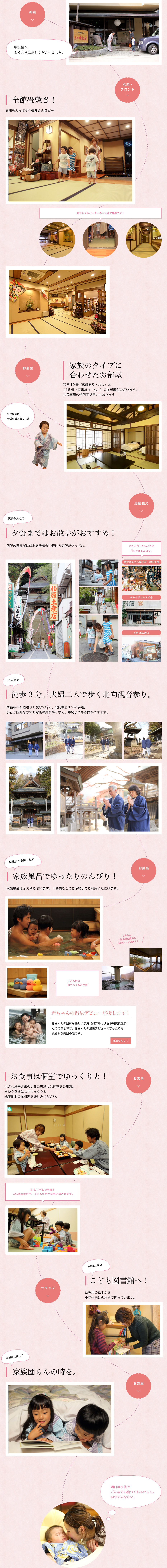 赤ちゃん連れの初めての旅行は不安がいっぱい。 荷物も多くなるし。。。赤ちゃんが泣き続けたら、きっと周りにも迷惑だろうし。。。 でも…久々に温泉旅館で気兼ねなく寛ぎたい。。。 そんな皆様の『不安』を解消してさしあげたい! 当館は赤ちゃん連れの旅行をサポートさせていただきます。 お子様歓迎のプランです〜