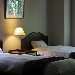 モダンな洋風の佇まいと和の設備を併せ持つ、山あいの静かな宿です。