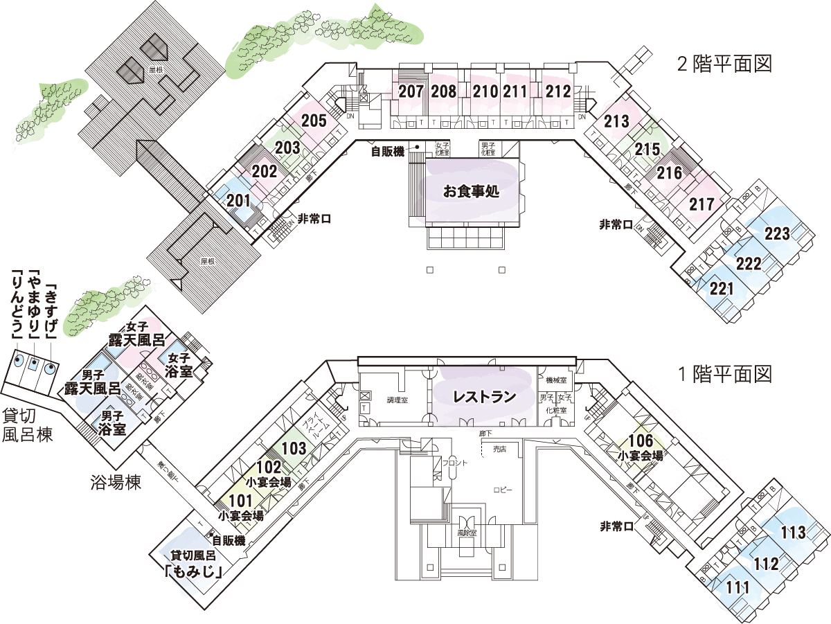 女性のお客様に彩り豊かな色浴衣のレンタルサービスをご用意しております。四季折々の風景に合わせた華やかな浴衣で、より特別な温泉体験をお楽しみいただけます。