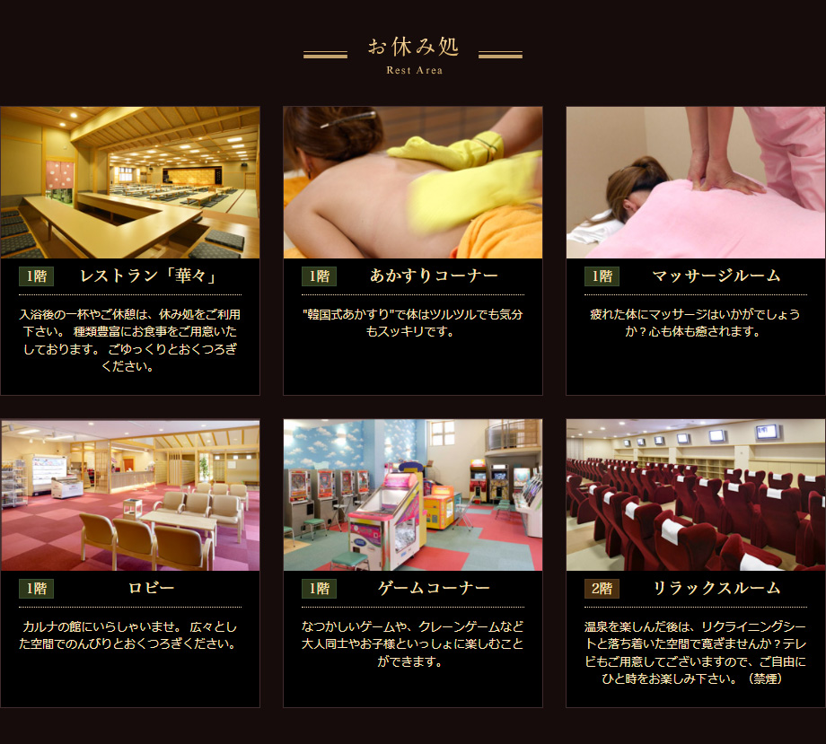 Aコース(40分)4,700円 あかすり、洗顔、洗髪、ボディシャンプー Bコース(70分)8,900円 Aコース+顔マッサージ+全身オイルマッサージ+蒸しタオル付 Cコース(80分)10,500円 Bコース+顔パック+ミルク仕上げ Dコース(15分)2,300円 角質取り |