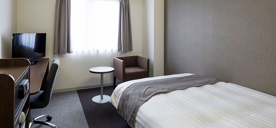 セミダブルサイズのベッドを設置した、機能的でコンパクトな客室。広めのデスクと
