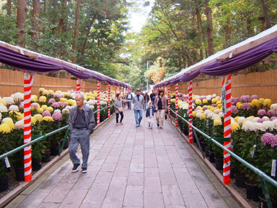 | 参道には、両端に見事な菊が飾られ、参拝客を楽しませてくれます。 |