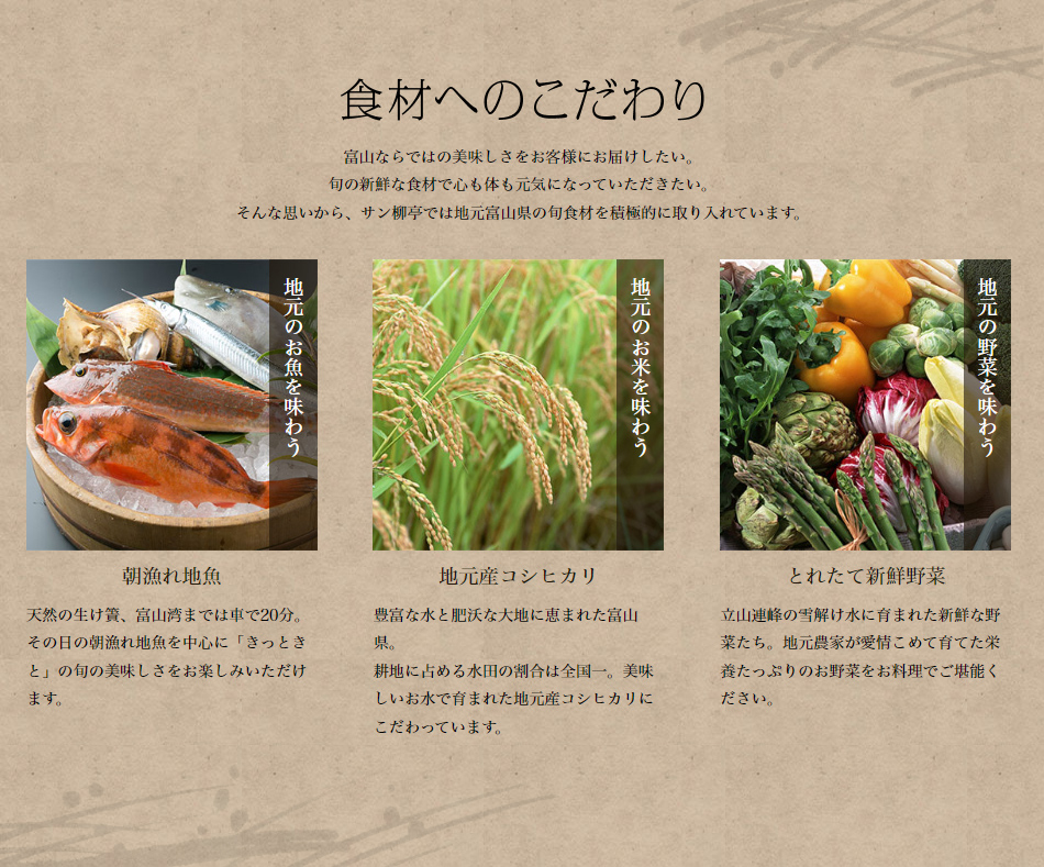 当館では、旬を盛り込んだ「地産地消」のご馳走を堪能できるコースをご用意しております。