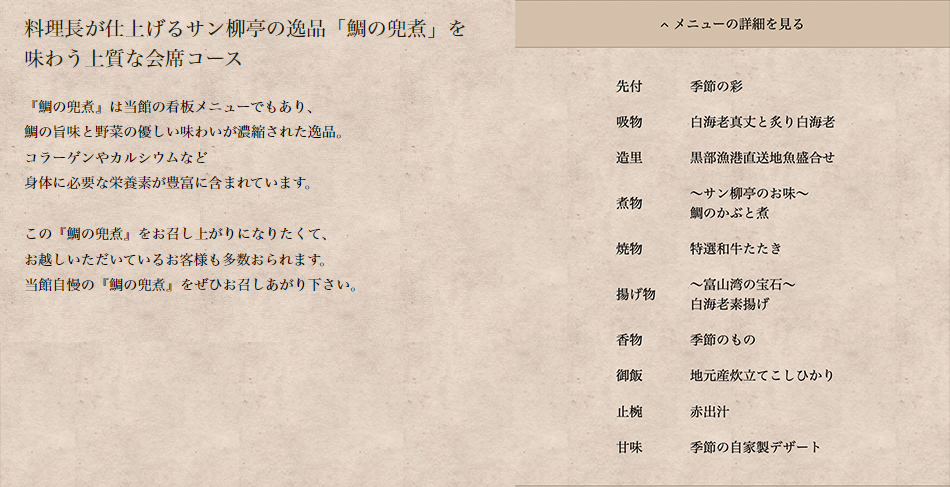 板長自慢の鯛の兜煮がメインのプレミアム会席コース