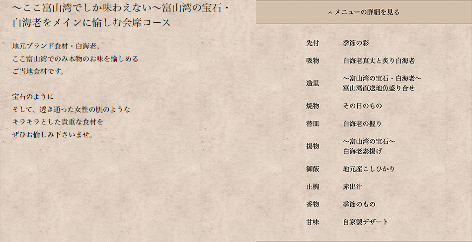 地元富山ブランド食材~富山湾の宝石・白海老~を愉しむ会席コース