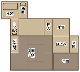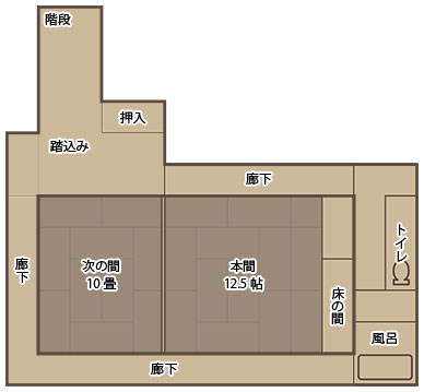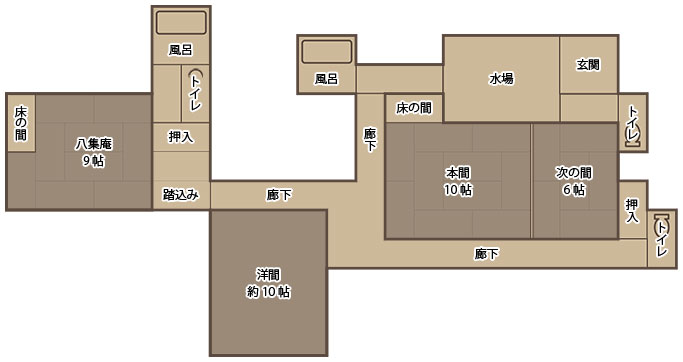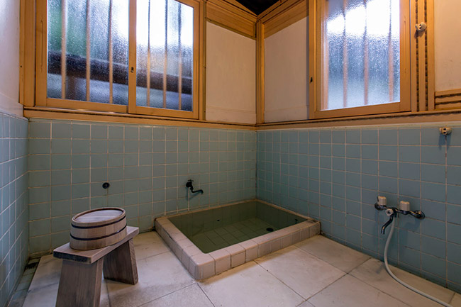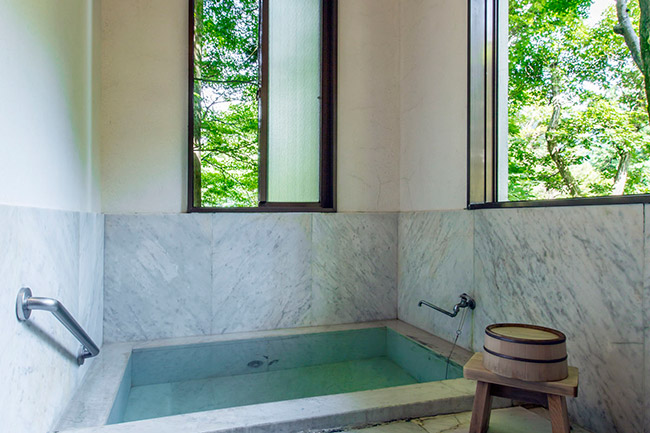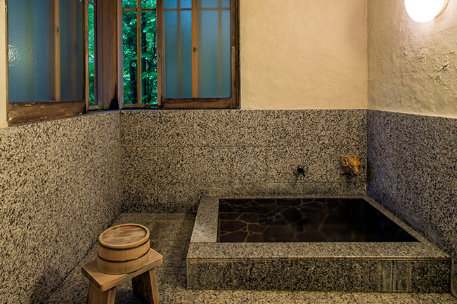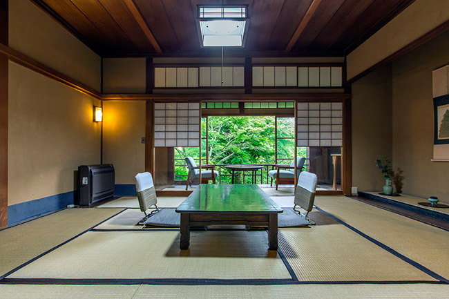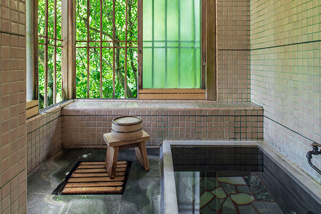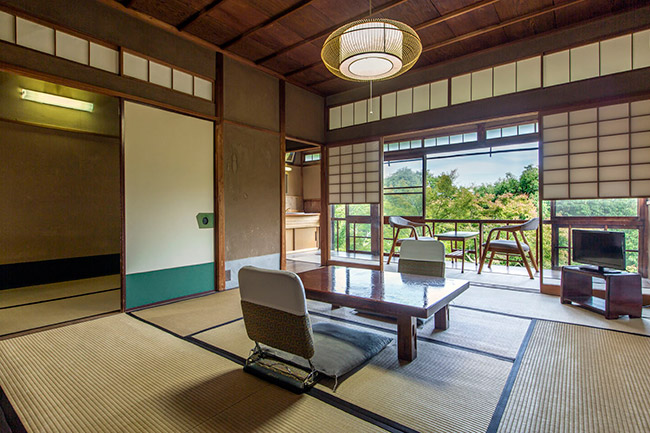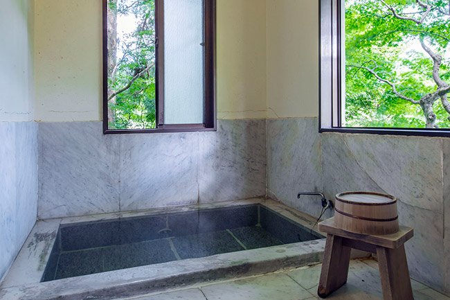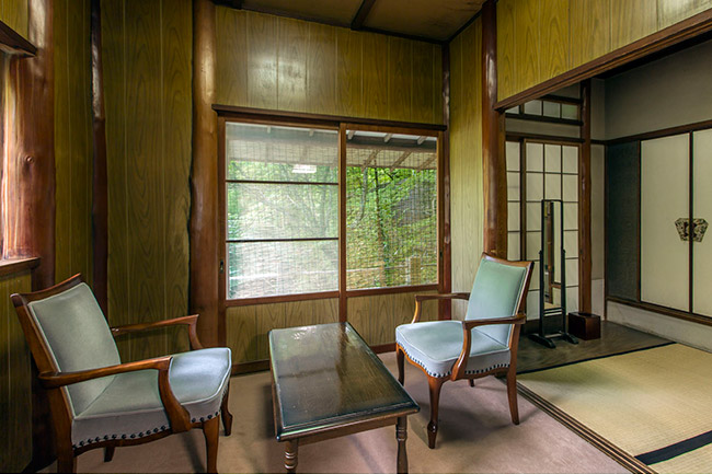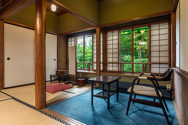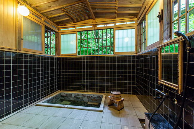 三菱の岩崎家が別荘として使用していた、大正4年建築のそのままのお部屋です。庭側の廊下窓は、全て木枠のガラス戸(大正時代のもの)です。広縁付きで直接庭に出ることができます。内湯は温泉掛け流しです。(手すりが付いています)