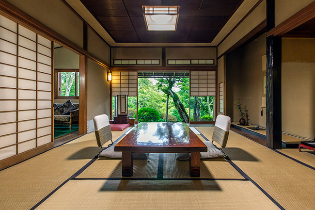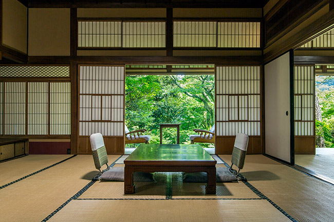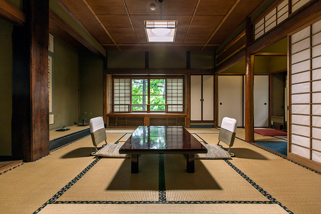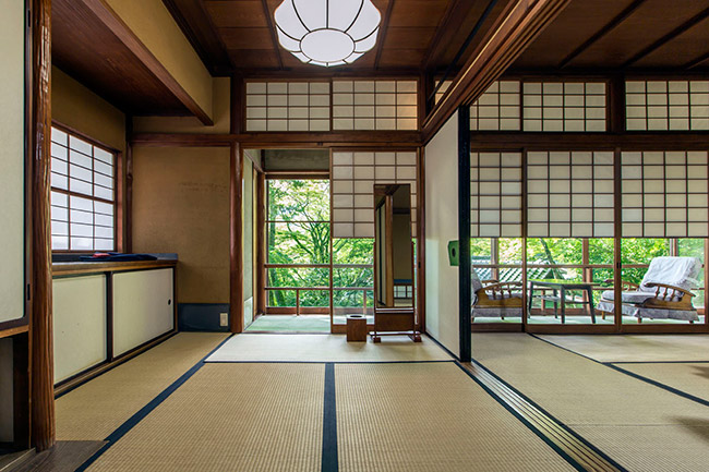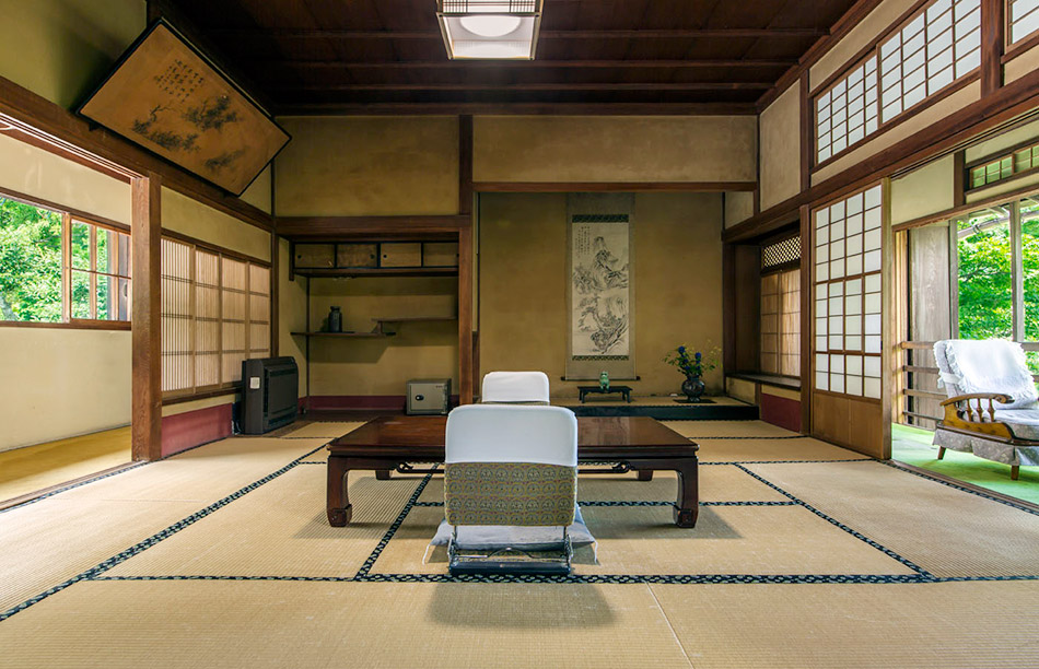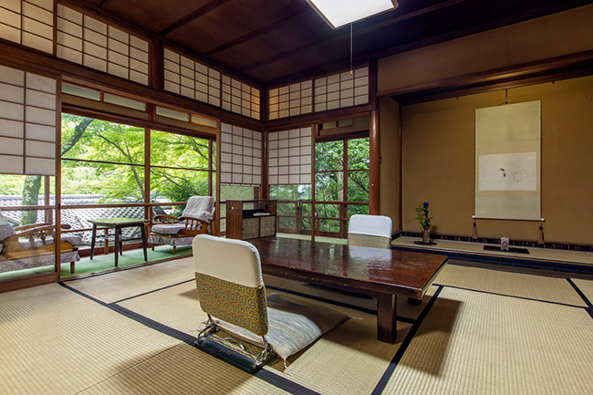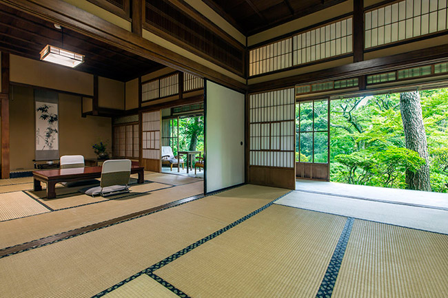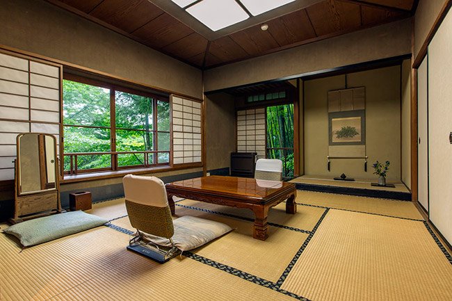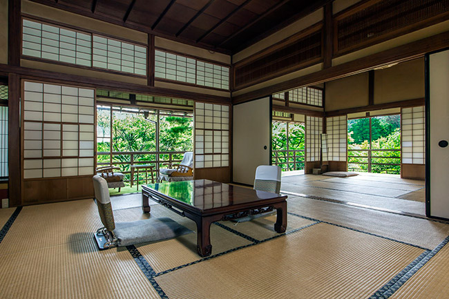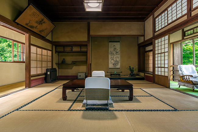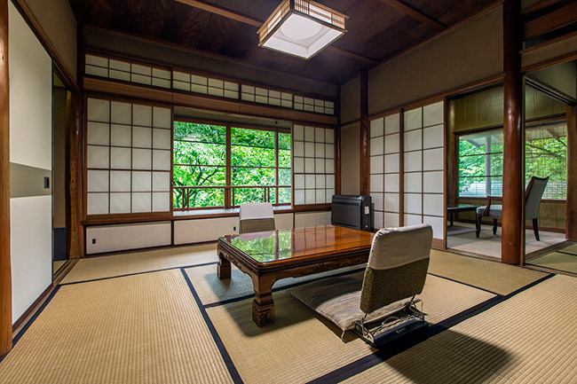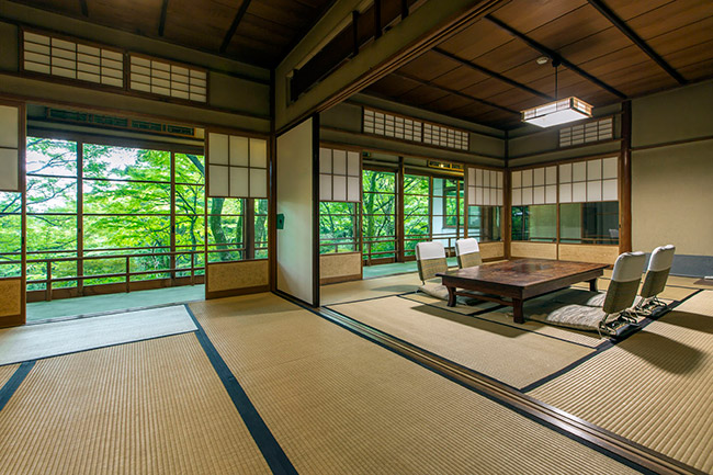 三菱の岩崎家が別荘として使用していた、大正4年建築のお部屋です。天井が高く手作りの欄間も特徴です。ほとんどの柱に”ふし”がなく、色艶の良い、木材が使用されています。