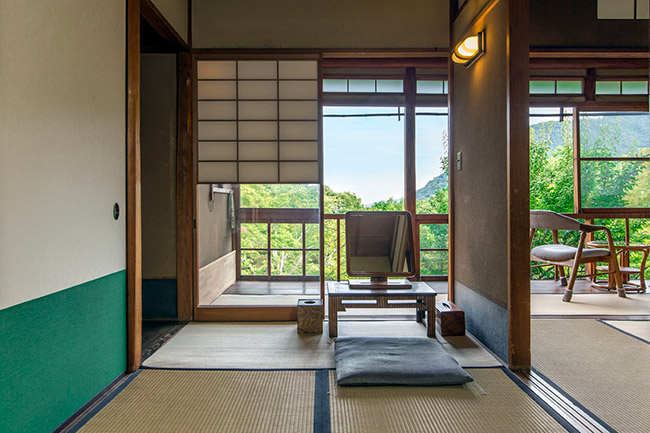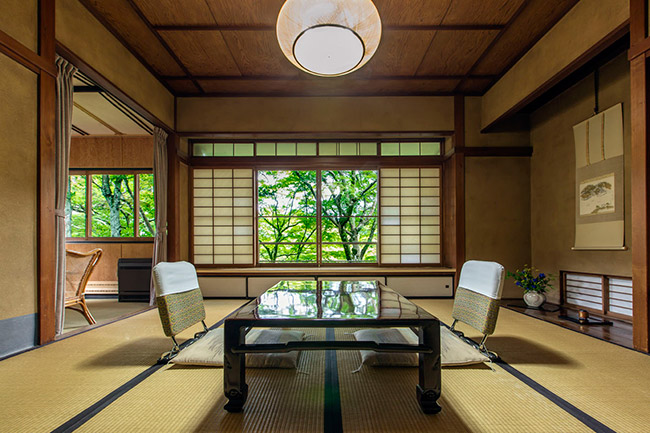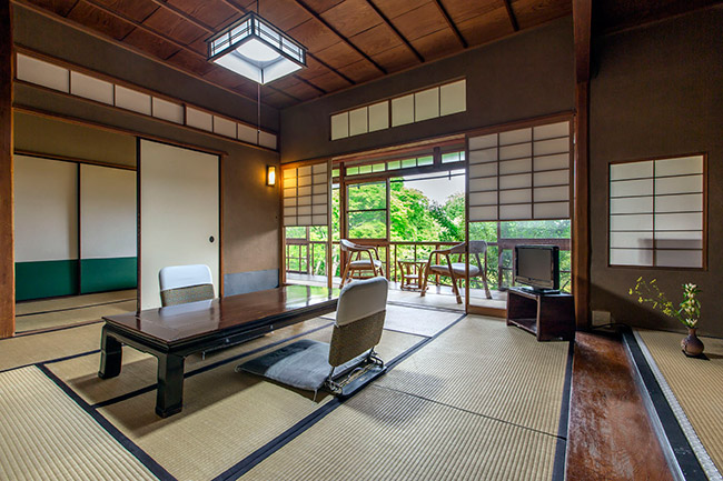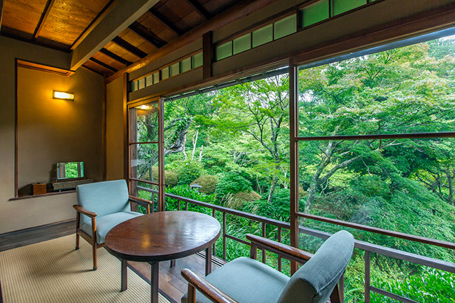 本館2階の眺めの良いお部屋です。庭側はすべてガラス窓になっております。明星ヶ岳の大文字もよく見えます。