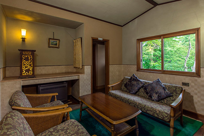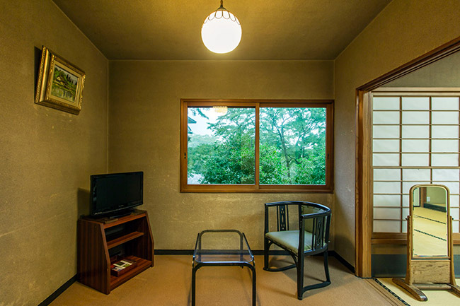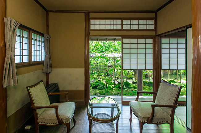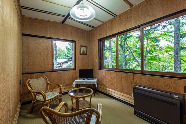 本館2階の眺めの良いお部屋です。庭側はすべてガラス窓になっております。