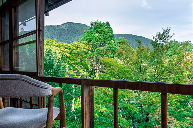 木の間から「大文字」が見える離れです。内湯は温泉掛け流しです。