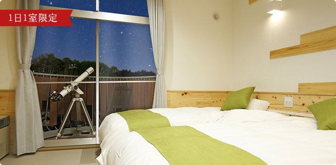 高原の満天の星空の元、夜空を楽しめるお部屋でゆっくりお過ごしいただくにもおすすめのバルコニー付き高原の星ルーム。