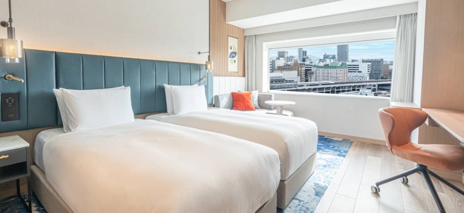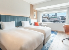 17階・18階の高層階に位置する上質でシンプルなインテリアと眺望が魅力のお部屋です。160センチ幅のベッドで、2名様でも広々とお過ごしいただけます。ご滞在中、20階のレストラン・バーフロアで専用メニューよりドリンク・スナック・スイーツをお楽しみいただけます。