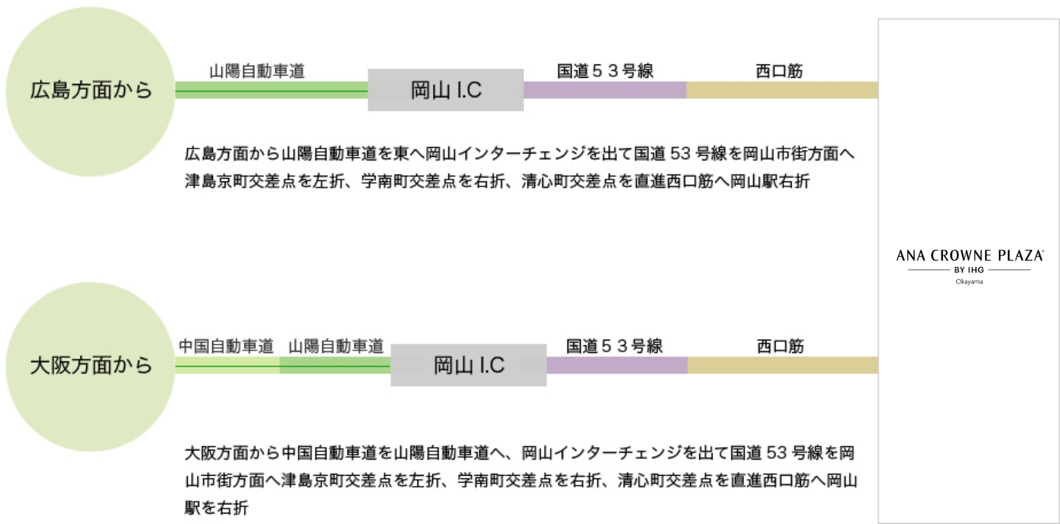 岡山市内のビジネス・観光はもちろんのこと、倉敷、高松、直島などへのワンデイトリップの拠点としても便利な立地となっています。