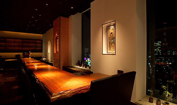 TEL 03-3543-3153カウンターには、樹齢600年の「花梨」を使用。 昼はラウンジ、夜はバーとして銀座の景観を一望。 |
