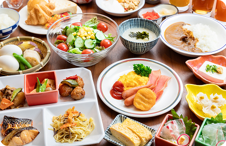 地元食材や和洋豊富なメニューを朝からしっかり楽しむ。
