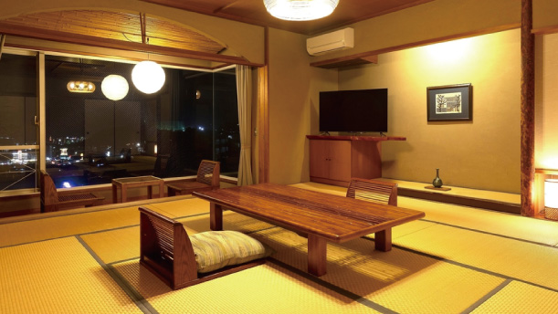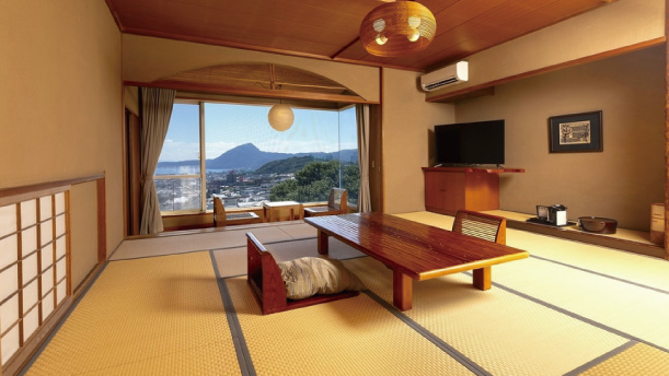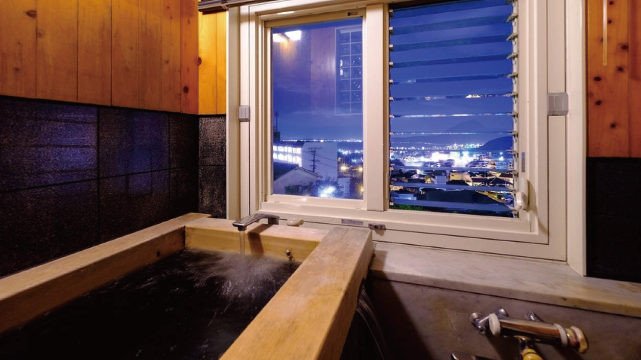 客室の窓からは別府の街並み望め、開放感に溢れています。お部屋食にも対応しており、お子様連れのご家族も安心です。全室、檜をあしらった石風呂の内風呂温泉が付いた和室です。