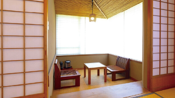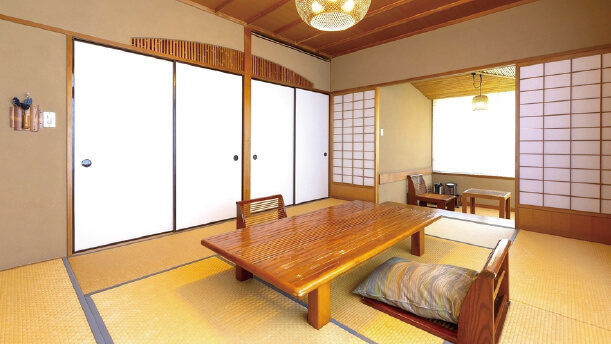 6畳+10畳の二間和室。檜をあしらった石風呂の内風呂温泉が付いたお部屋です。最大でお布団を6組迄敷くことができ、お子様連れや大人数でのご利用に最適です。