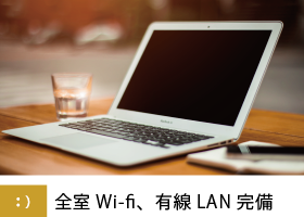 ![]() 全室Wi-Fi完備で、インターネットがご利用いただけます。LANケーブルも全室完備ですので、有線ネット接続も可能です。 |
