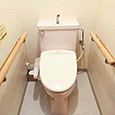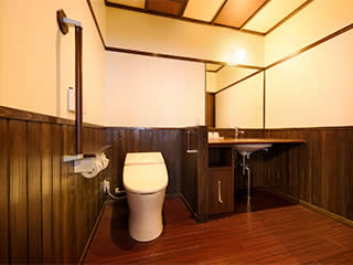 当館はすべての客室がトイレ付です。また館内のすべてのトイレに 温水洗浄便座(ウォシュレット)と手すりを設置。車いす特別室には車いすのままでも利用しやすい広めのトイレが付いています。