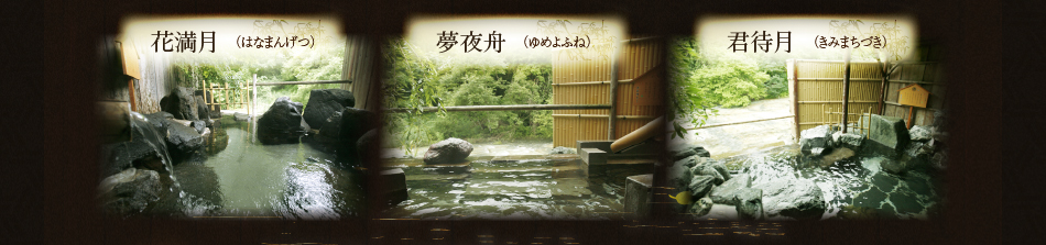 当館の貸切露天風呂は、4〜5人は入れる大きさの、源泉かけ流しの岩風呂です。花満月(はなまんげつ)・夢夜舟(ゆめよふね)の2種類。それぞれが景観の異なる造りとなっております。料金:2,200円(45分)営業時間 15時〜23時 チェックイン後にご予約を承ります。
