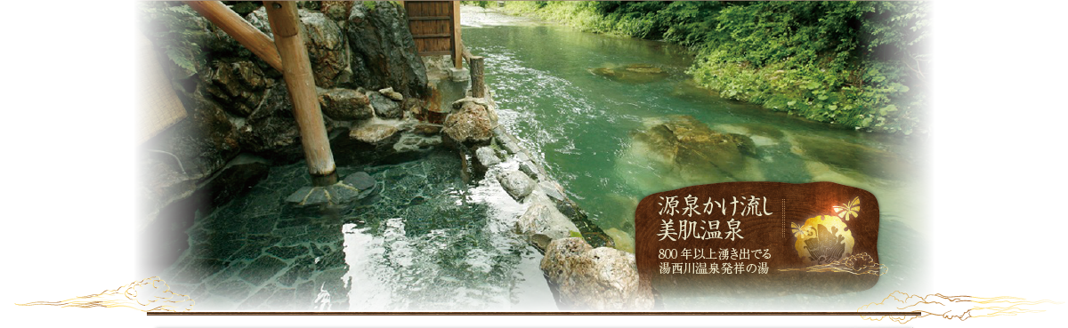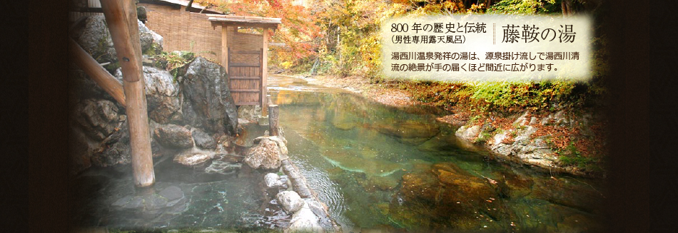 当館の露天風呂大浴場「藤鞍の湯」は、800年以上前に発見されたと言われる湯西川温泉の源泉です。