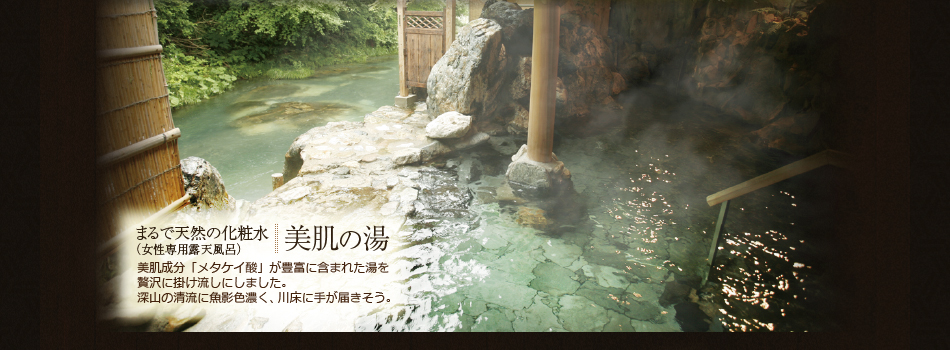 当館の温泉は、美肌成分の「メタケイ酸」がたっぷり含まれた美肌の湯としても有名です。