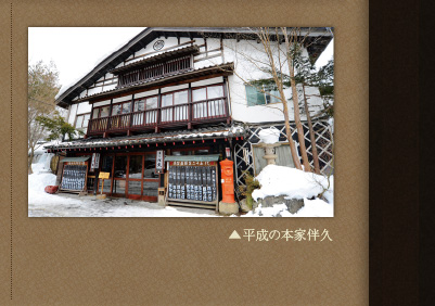 1666年(江戸初期)湯西川が村落として存在し始めた頃、良質の温泉の評判も近隣に聞こえるようになり、湯治宿屋の伴久旅館(本家伴久)の創業となりました。その後、幕藩体制の終焉・明治維新・昭和の大戦など、激動の時代の流れの中で、人々の心身を癒す湯宿として、この地を訪れる旅人をもてなし続けてきました。