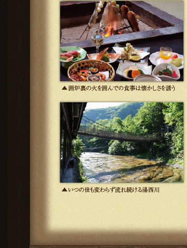 都より逃れこの原生林の中で、人間古来の平和な狩猟採集生活様式を通して、先祖が子孫へと生き繋いできたことに想いをはせ、当館の御夕食処は、当時の生活をしのぶ造りです。お部屋は湯西川の丸木や自然素材のみで組み立てられた高床式。ランプの下、囲炉裏の火を囲むと、人類の源流へ回帰する懐かしさに包まれます。
