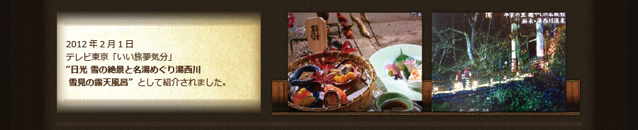 伴久の横を流れる湯西川は、日本の歴史の変遷を見続けてきたのです。忙しさの中で暮らす現代人に、「都人(みやこびと)よ、たまには、原点に帰られませ、癒されませ。」と湯西川の清流が語りかけているようです。都心に流れ込む川の上流の深山渓谷への旅は、人生の原点に回帰していく旅であるかのようです。川はいついかなる時も悠々と流れ、時には怒り、時には和み、人類の命を生かし、その営みをやさしく見守り続けています。
