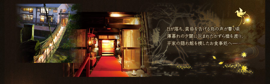 かずら橋を渡った「平家隠れ館」は囲炉裏ダイニング。山の丸木を組みあげた高床式の古民家造りとランプ灯の懐かしい風情です。