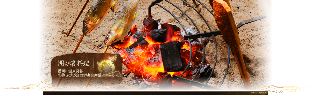 当館のお夕食では、赤い炭火で新鮮な深山の幸を焼きあげる名物囲炉裏焼きと、四季折々・旬の素材を活かした創作会席料理の両方をお召し上がりいただけます。