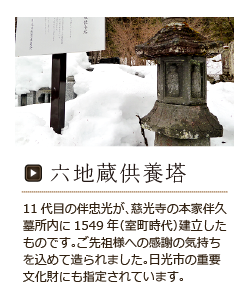 平清盛公の孫・平忠房公より11代目の伴忠光(正式名:伴対馬守忠光)が1549年(天文18年)の室町時代に、当館から徒歩5分のところにある慈光寺の、本家伴久墓所内に建立したものです。 ご先祖様への感謝の気持ちを込めて造られました。日光市より、湯西川温泉で最古の建立物として、重要文化財に指定されています。(伴久の歴代館主の苗字である「伴」は平家の人という字を変形した隠れ姓名です)