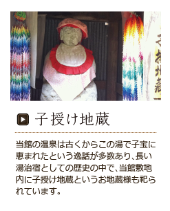 当館の温泉は古くからこの湯で子宝に恵まれたという逸話を持つ方が多く、 長い湯治宿としての歴史の中で、当館敷地内に子授け地蔵というお地蔵様も祀られています。館内の随所に飾られている書を書かれた栃木市在住の井上桂月女史の御出生は、昭和初期に母上が中々御子に恵まれない中、当館の子宝の湯の噂を聞き、二週間程、本家伴久に湯治をされ、直後に女史を授かられたという奇しきご縁がございます。